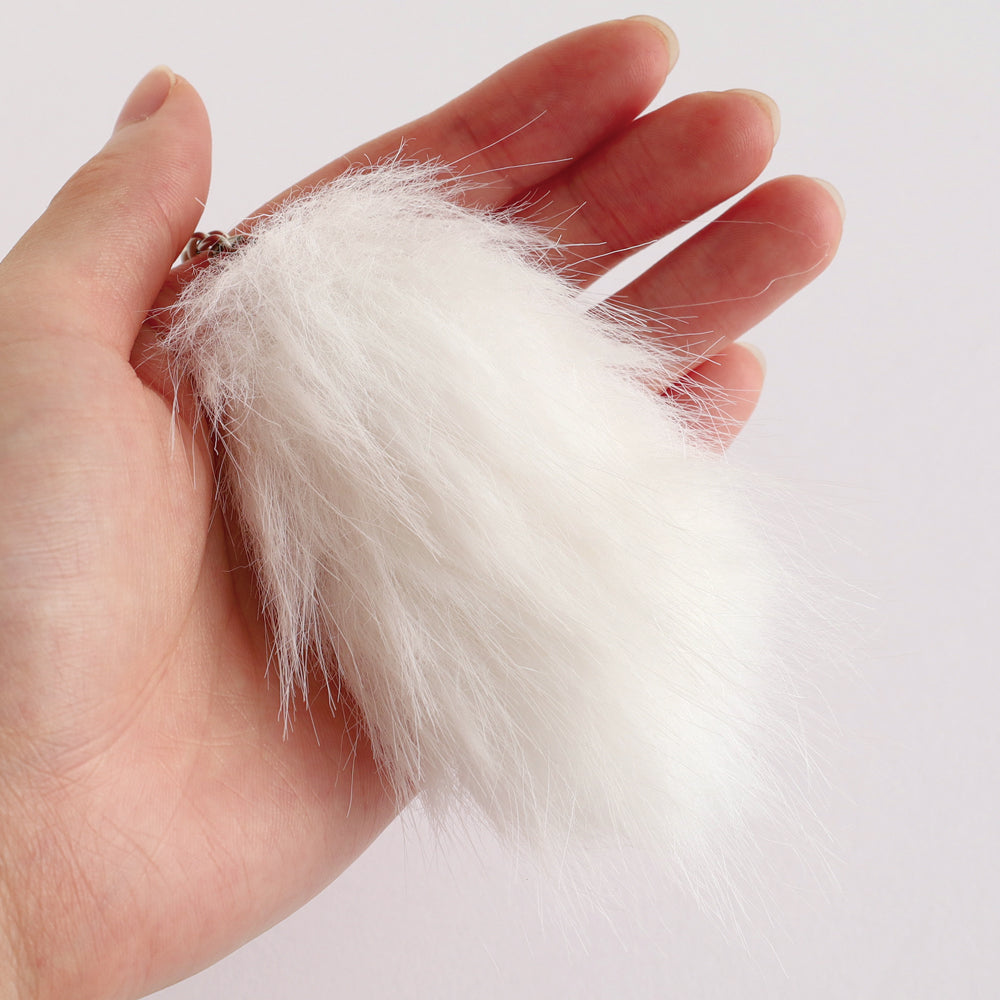 This cute keychain combines glittery acrylic inspired by unidentified creatures with fur and tulle ribbon for a jingling feel.